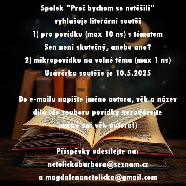 Opětovně vyhlašujeme literární soutěž! Tentokrát se jedná pouze o soutěž literární, ale za to zde je tentokrát možnost nejenom povídky, ale také i mikropovídky. O cenách vás budeme informovat průběžně, ale nebojte se. Je na co se těšit. Také pro vás pro rok 2025/2026 chystáme překvapení. Uhodnote o co se jedná?